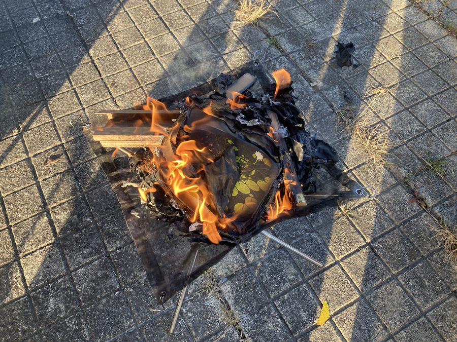 焚火は前々回と同じく、学生時代の作品や画材やその他額などを盛大に燃やした。寒くなくても炎を見ると心が落ち着く。今回は版画などの紙系も多かったのだが、一生懸命制作した作品が燃えているのを見ていると、少しだけ寂しい気分になった。ネモッちゃんが「いいんですか、いいんですか?」と聞く。そう、さようなら〜!だ。