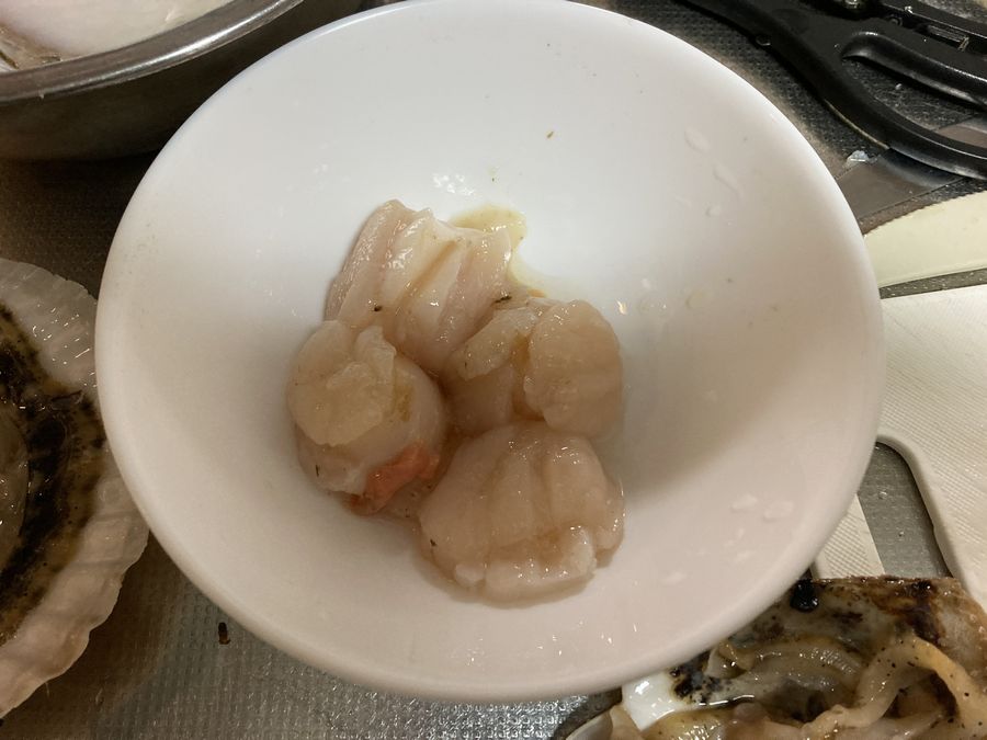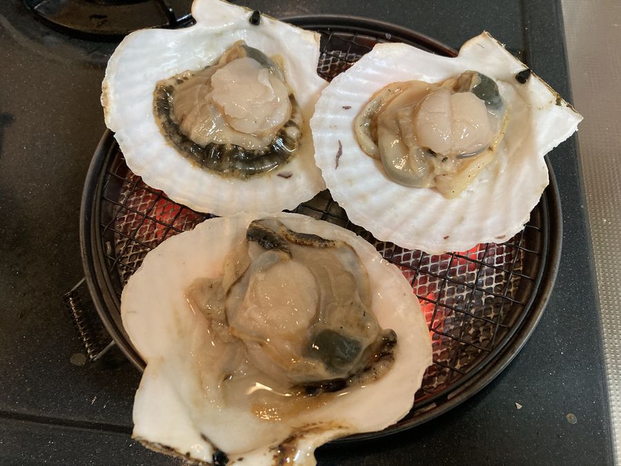 貝柱がちょっと小振りなだけで新鮮さは折り紙付き。鮮度が落ちる前に食っちまおうぜ、と妻と食す。生きているから貝殻を強く閉じてしまって、なかなかナイフをさしこませてくれなくて苦労した。12個ぐらい有ったが半分は焼き、もう半分は刺身にした。刺身にした方のヒモも焼いて食った。バター醤油と合う〜。